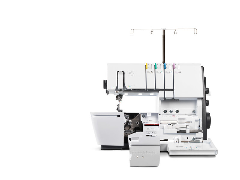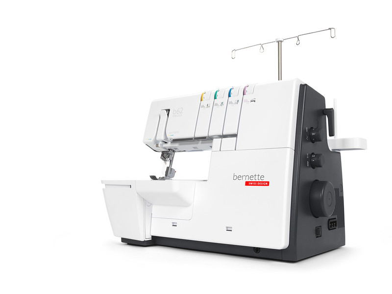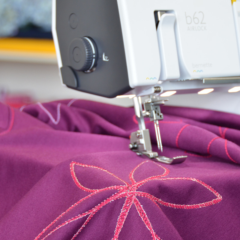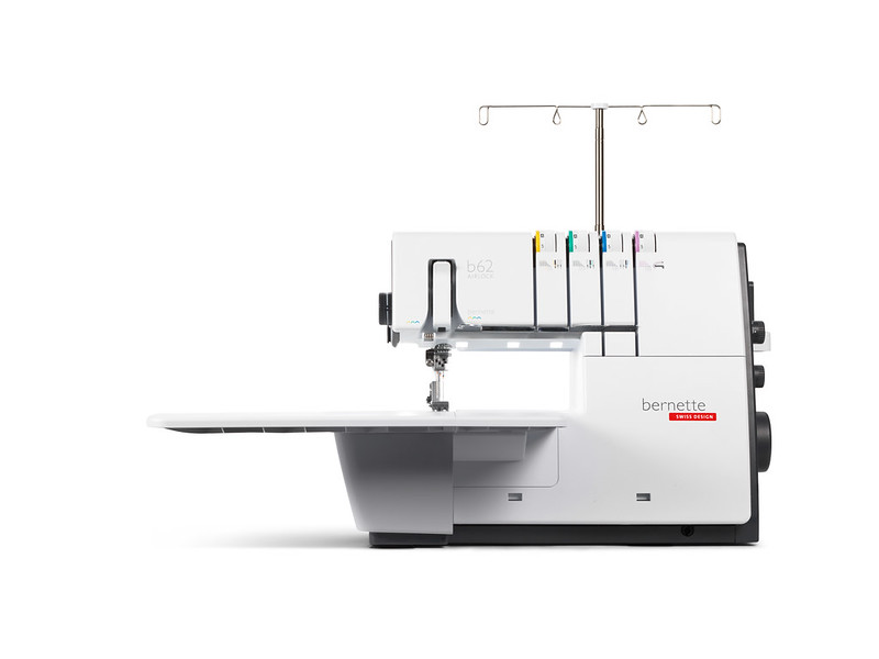 The bernette 62 AIRLOCK is the coverstitch machine of the b60 series. The automatic air threader makes threading the looper thread child’s play. The machine has 4 coverstitches and 3 chainstitches and can be used for countless applications, with which different fabric types – stretchy fabrics in particular – can be sewn perfectly. The presser foot can be lowered and temporarily raised with the knee lifter, leaving both hands free to guide the fabric. The slide-on table and matching coverstitch insert increase the sewing area and provide sufficient space for large projects. Thanks to the 5 LEDs, the large working area is brightly illuminated.