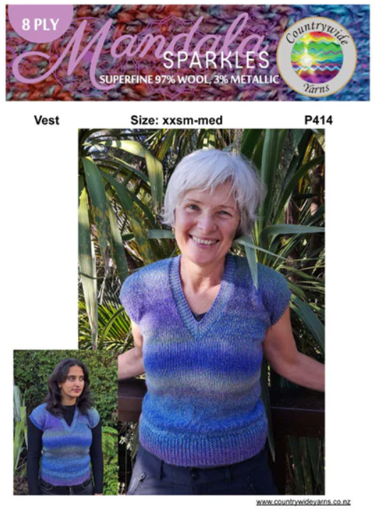 Knit yourself a touch of sparkle with this sleeveless vest pattern, designed especially for Countrywide Yarns Mandala Sparkles 8ply. With its subtle colour shifts and metallic thread, this yarn brings understated glamour to everyday wear.