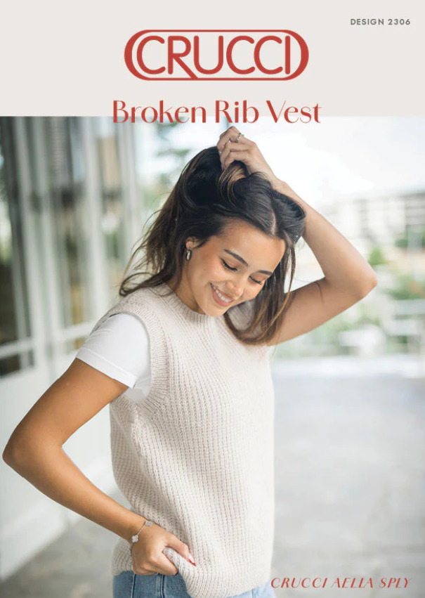 This pattern is for a women’s broken rib vest, using CRUCCI 8ply wool. Intermediate skill level required. Comes in sizes S-XXL.