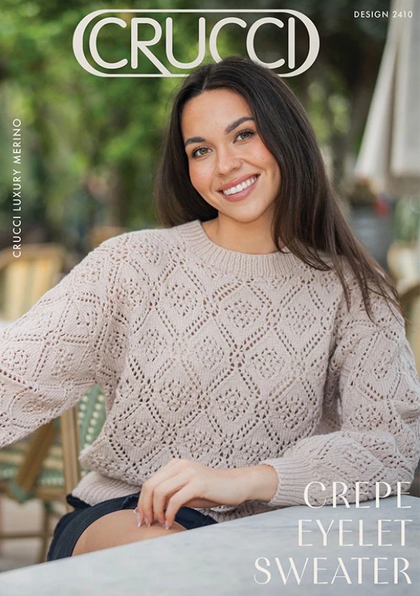 This pattern is for a woman’s crepe eyelet sweater, using Luxury Merino Crepe DK wool. Very experienced skill level required with patience! Comes in sizes S-XXL.