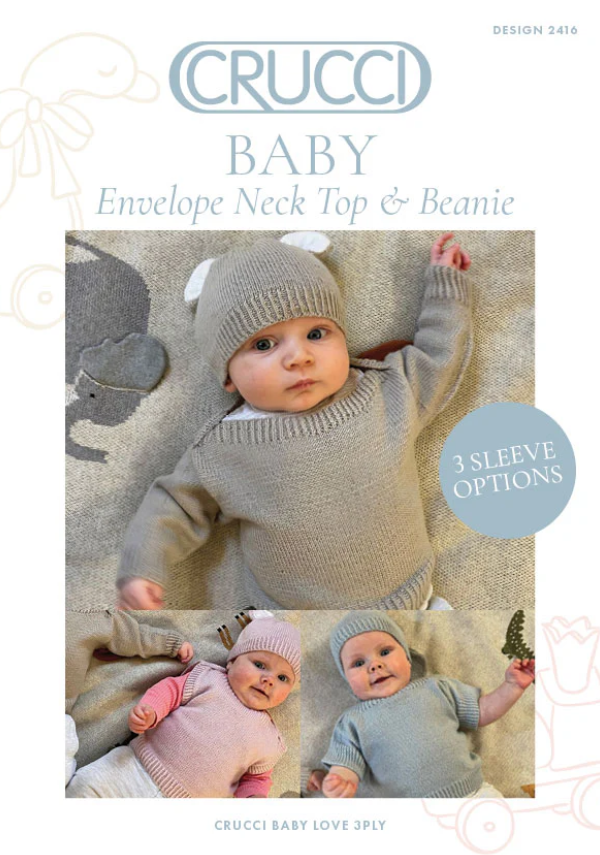 Pattern design 2416 is for a baby’s 3ply envelope neck top and beanie – with three different sleeve length options. This pattern uses Crucci Baby Love 3ply. Intermediate skill level. Comes in sizes 3 – 18 months.
