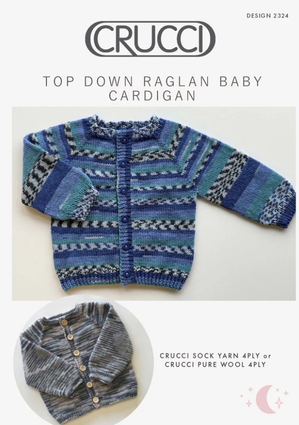 Pattern design 2324 is for a baby’s top down raglan cardigan. This pattern uses Crucci 4ply Soft Yarn or Crucci Pure Wool 4ply.