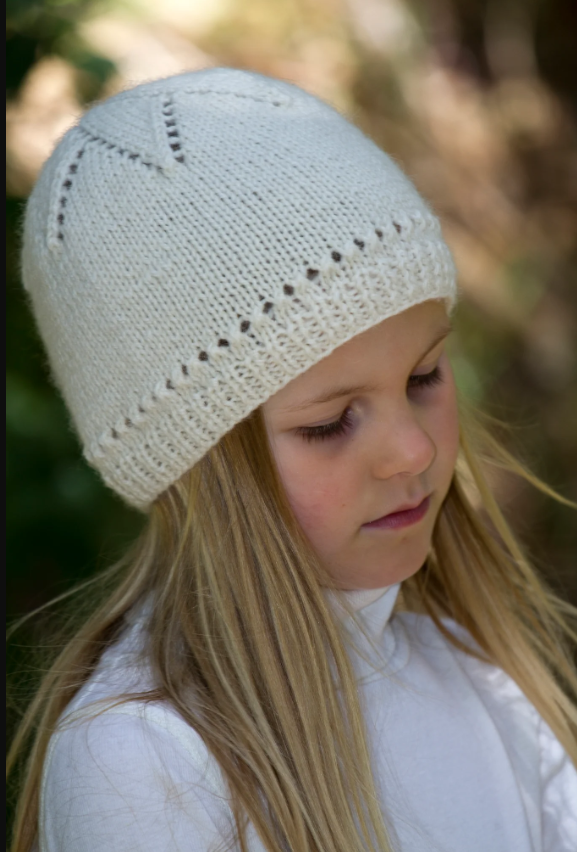 A beautiful knitted hat with a lacy star pattern and eyelet details.